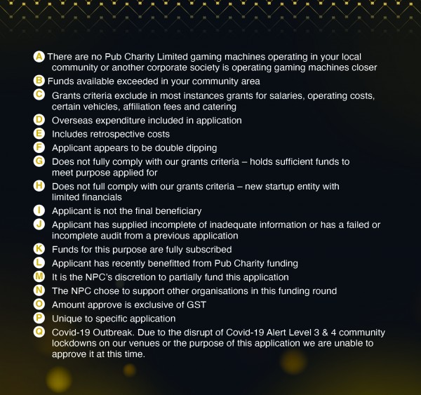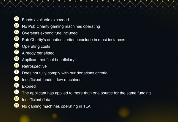 As of the 19th of September 2018 funding round Pub Charity Limited will be using a new set letter codes to indicate why an application was declined or only partially funded. If your application was made during or after this round please refer to this table for declined codes however historical applications made before the September 19th 2018 round will still use the old code system which is supplied further bellow along with approved and declined lists from this period.