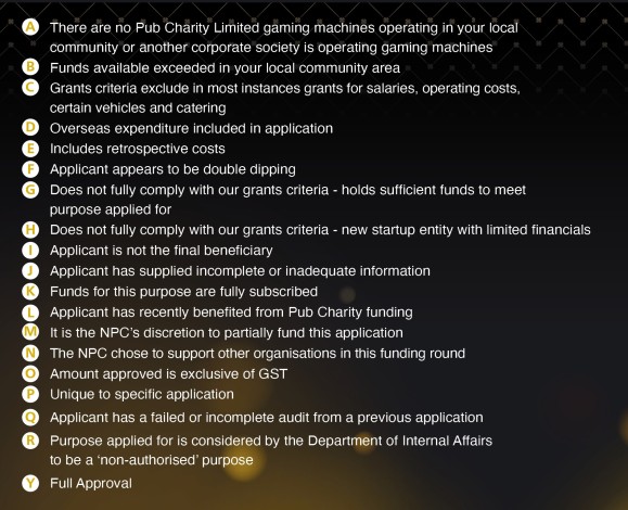 As of the 23rd of October 2024 funding round Pub Charity Limited will be using a new set letter codes to indicate why an application was declined or only partially funded. If your application was made during or after this round please refer to this table for declined codes however historical applications made before this date will still use an older code system.
